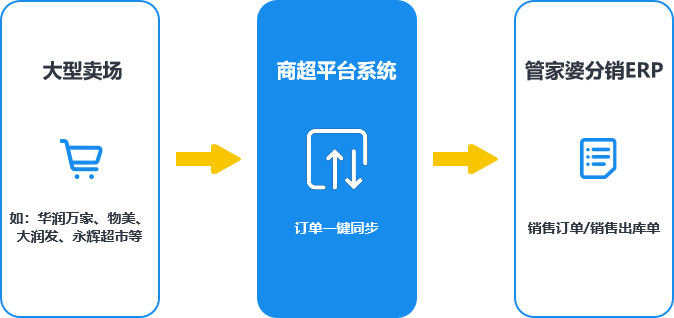 通過(guò)商超平臺(tái)系統(tǒng),一鍵把大型商超連鎖的訂單導(dǎo)入到管家婆分銷(xiāo)ERP中,生成銷(xiāo)售訂單或銷(xiāo)售出庫(kù)單,降低人力成本,提升效率。