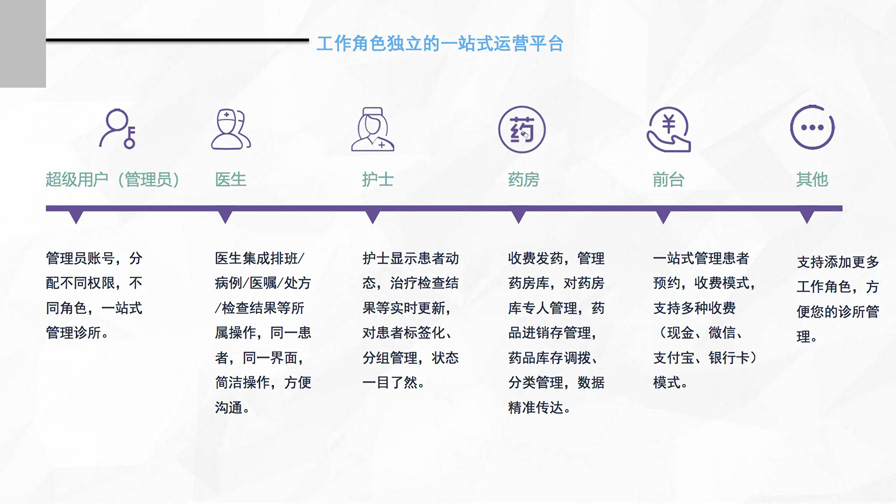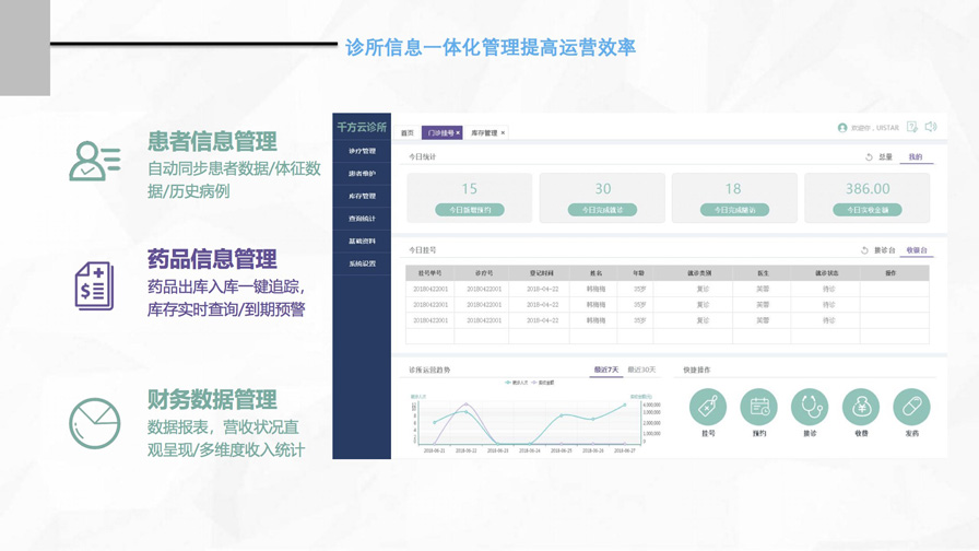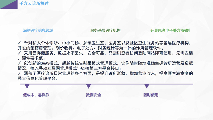 千方云診所是集藥房管理、劃價收費、電子處方、財務(wù)統(tǒng)計、中醫(yī)智能診斷等為一體的診所管理軟件。采用云存儲服務(wù),數(shù)據(jù)永不丟失,安全可靠,只需瀏覽器訪問登陸網(wǎng)站即可使用。