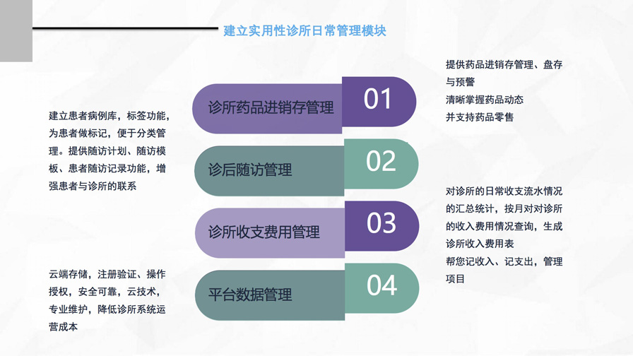千方云診所是集藥房管理、劃價收費、電子處方、財務(wù)統(tǒng)計、中醫(yī)智能診斷等為一體的診所管理軟件。采用云存儲服務(wù),數(shù)據(jù)永不丟失,安全可靠,只需瀏覽器訪問登陸網(wǎng)站即可使用。